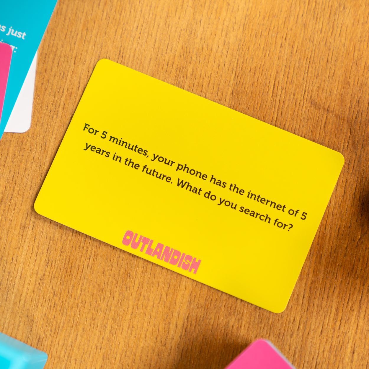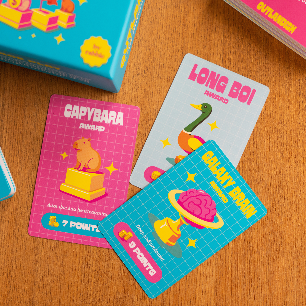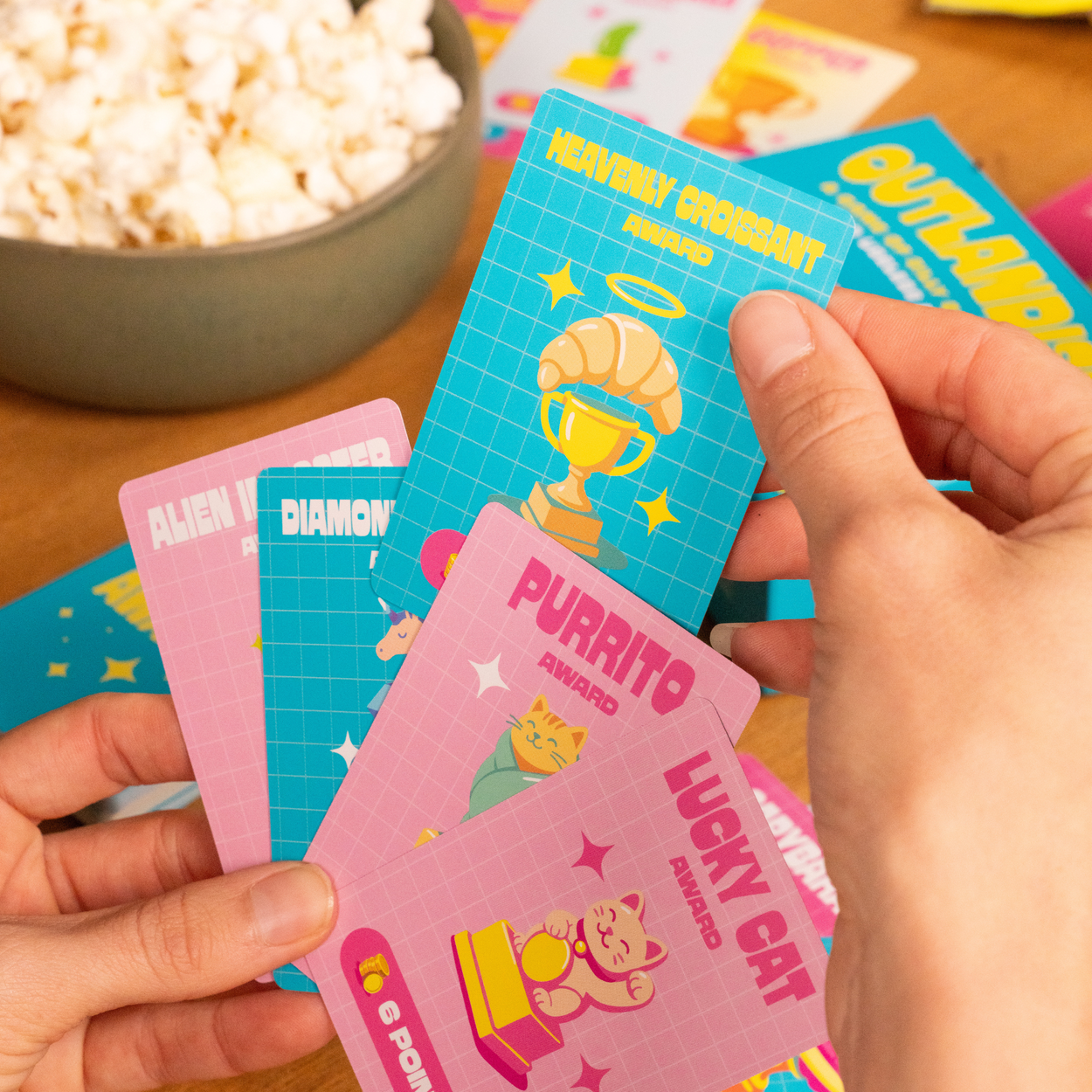 Also included are 75 awards to hand out for the weirdest, wisest, and boldest answers. Decide who deserves the “Lucky Cat Award,” or the “Dumpster Fire Award.” Collect as many awards as possible to see who is the most Outlandish!